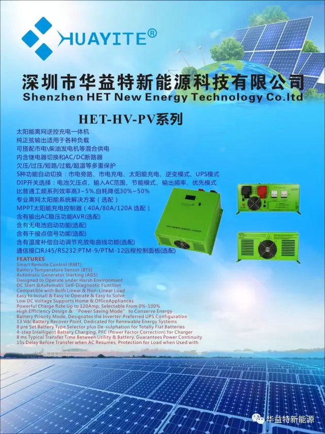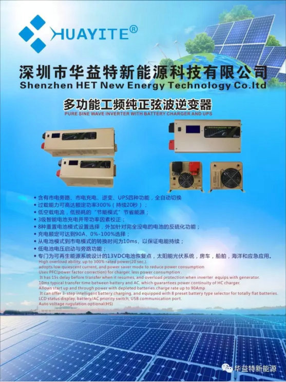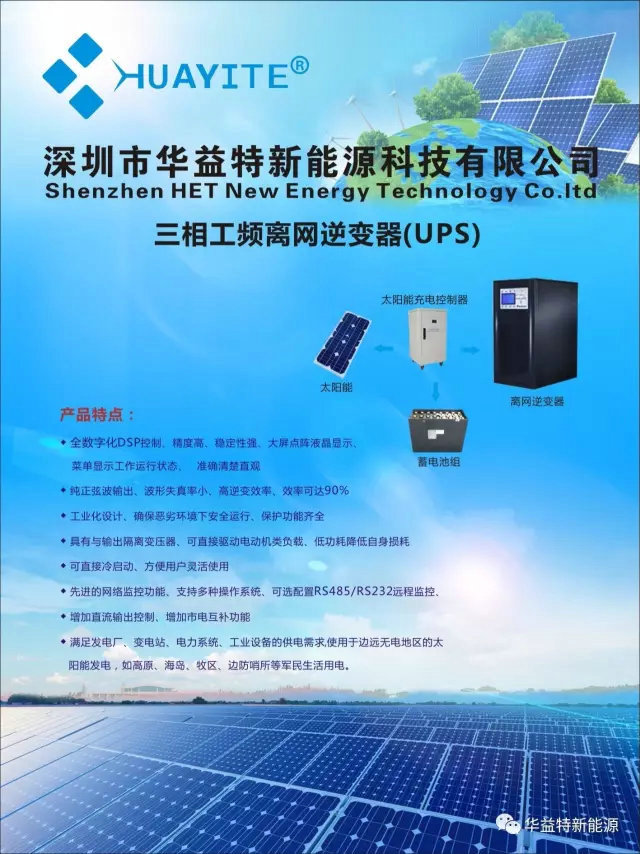 華益特新能源是一家集研發(fā)、生產、銷售和服務為一體,專業(yè)生產純正弦波逆變器,UPS電源,太陽能(風)能發(fā)電系統(tǒng),太陽能控制器,儲能離網系統(tǒng),電力通信逆變器,太陽能電池板,蓄電池等能源電力電源產品的國家重點高新技術企業(yè)。
